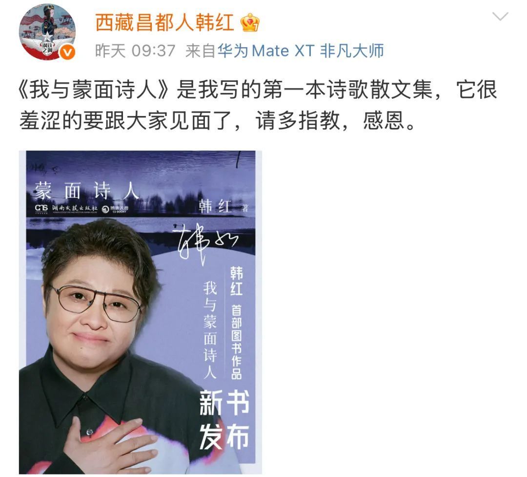 歌手韩红此前在微博发文,宣布自己的新书出版:“《我与蒙面诗人》是我写的第一本诗歌散文集,它很羞涩的要跟大家见面了,请多指教,感恩。”